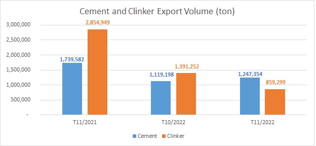 Domestic cement consumption in November decreased by 2% compared to October, reached 5.26 million tons. Accumulating 11 months, cement consumption in the domestic market is estimated at 57.19 million tons. Export of cement and clinker in November still kept increasing momentum, reached 2.51 million tons. 11 months export of cement and clinker was estimated at 28.87 million tons.
