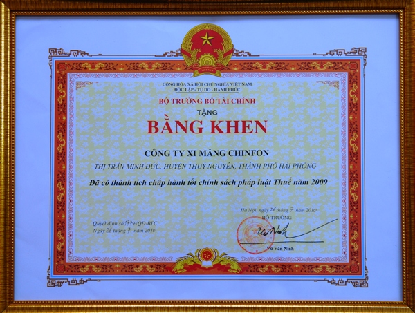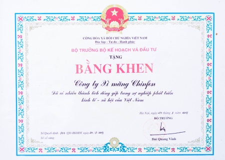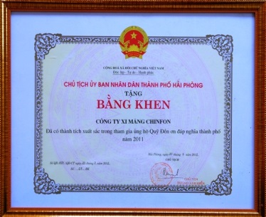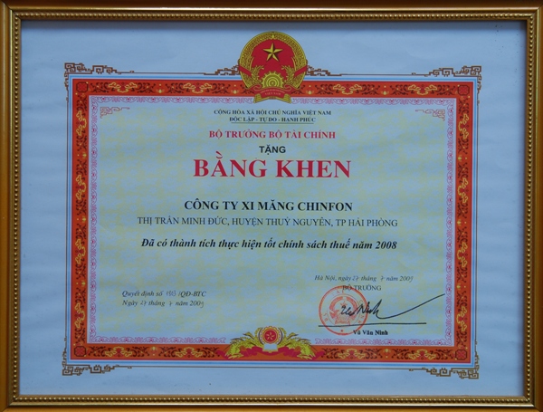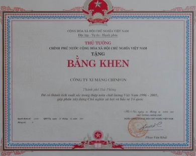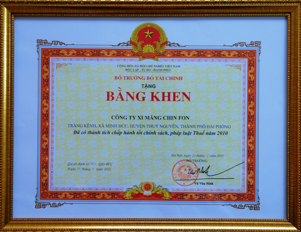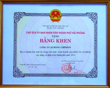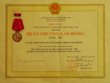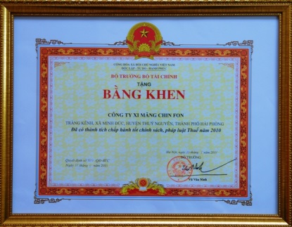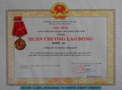 Through 30 years of establishment and development, with excellent achievements in business operation and out-standing contributions to the social economy, Chinfon Cement Corporation was awarded the Labor Medal, 2nd & 3rd Class by the State President and many prestigious awards by ministries, sectors and domestic & international organizations.